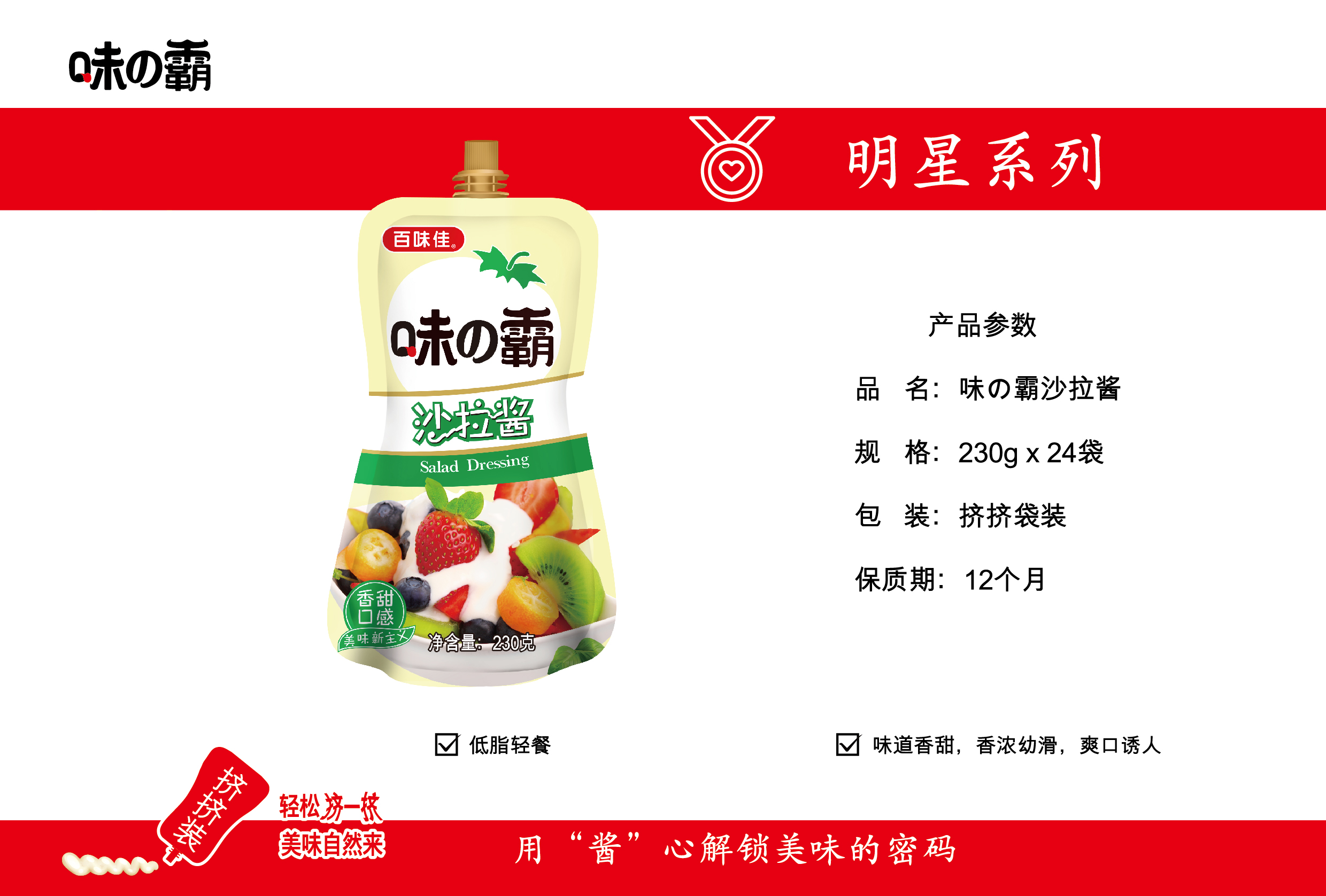 沙拉醬(擠擠裝) 相關(guān)產(chǎn)品: 沙拉醬(擠擠裝) 味の霸橙飲料濃漿810ml2016/07/08 冬陰功醬90g2016/07/08 牛雜醬效90g2016/07/08 味の霸番茄沙司(擠擠裝)2016/07/08 沙拉醬(擠擠裝)2016/07/08